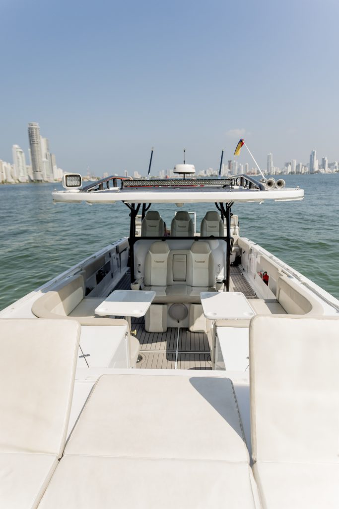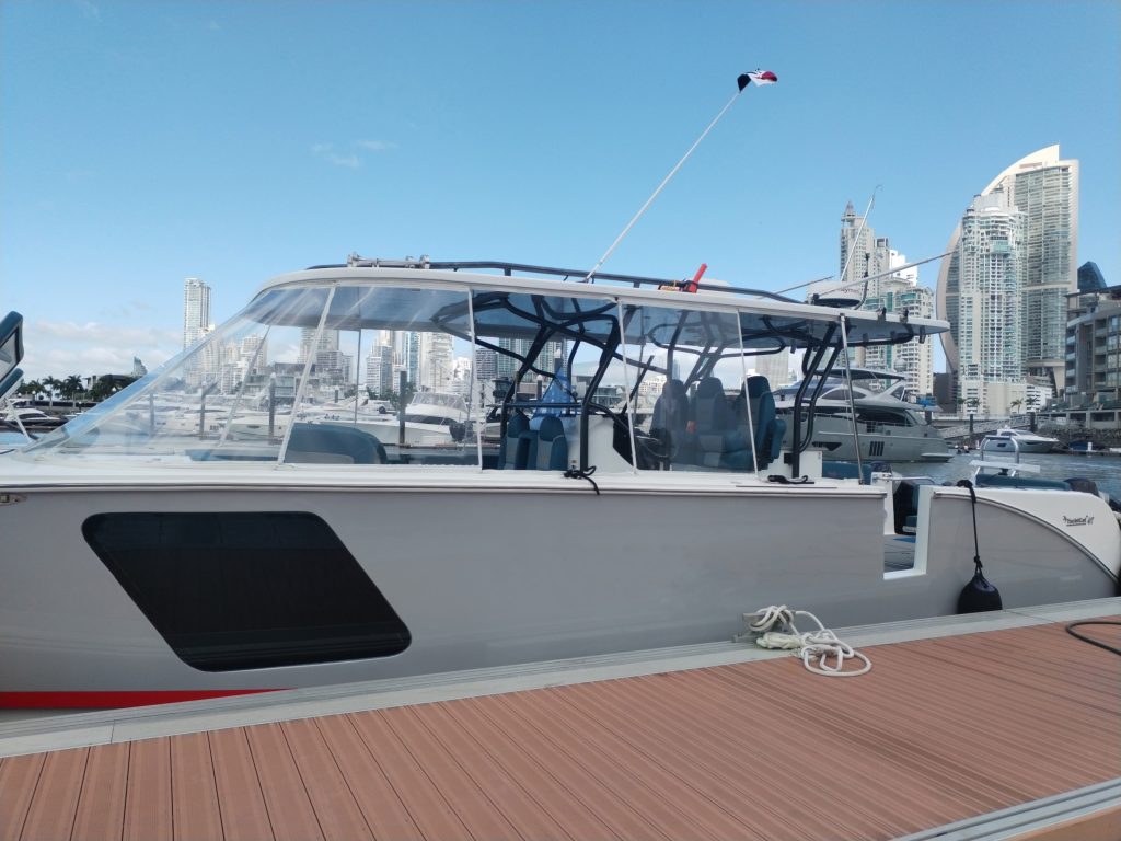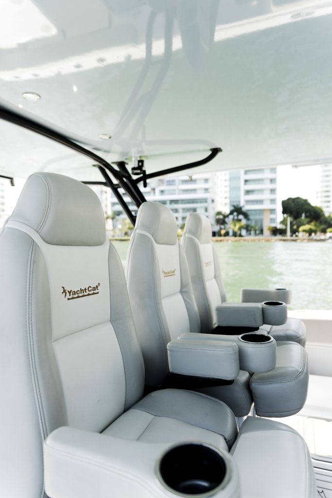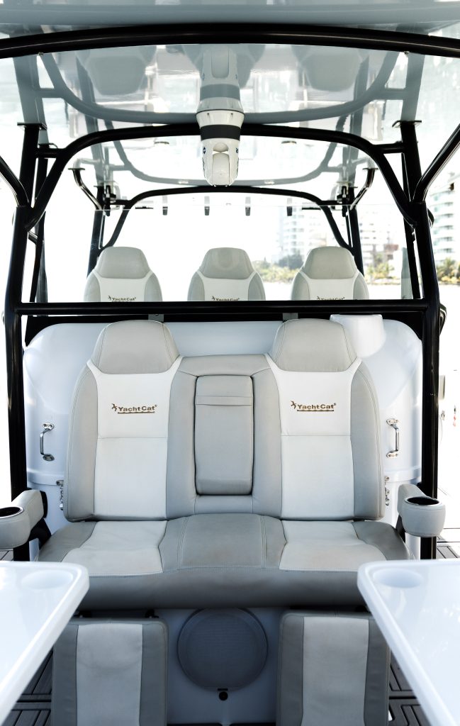 The Yachtcat 41 is equipped with an advanced center console designed for optimal functionality and comfort. Standard features include three seats within the console and two front seats, providing ample seating for passengers.