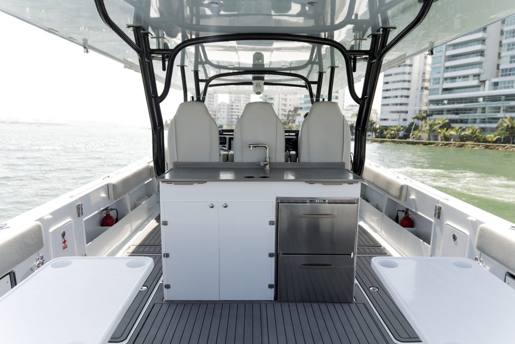 Enhance your yachting experience with the optional prep center available for the Yachtcat 41. This additional feature includes a sun galley, sink, countertop, cooler, cupholder, and storage compartments. Perfect for preparing snacks and drinks while on the water, this convenient addition ensures you have everything you need for a memorable voyage.