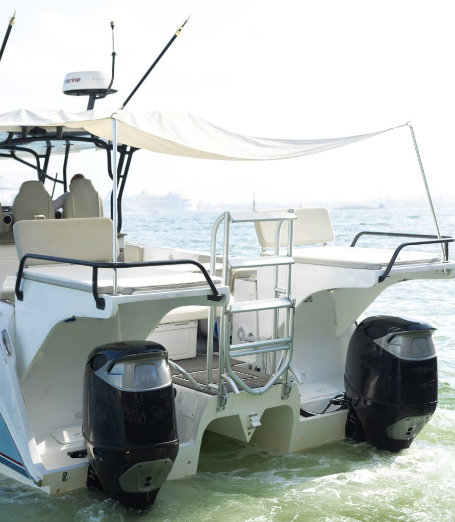 The stern area of the Yachtcat 41 is designed for entertainment and relaxation. Features may include folding sofas, fiberglass tables, coolers with cushions, rod holders, and a water access ladder.